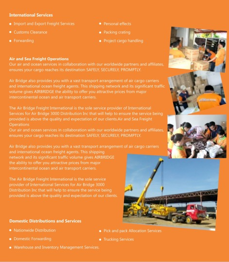 Airbridge strictly aims to meet the demands of its client by providing   them a noble service in an affordable and timely manner. Its services  are  intended to meet urgent transactions with high level of   professionalism,  cost-efficiency and confidentiality. Likewise, it intends   to play an essential  role in continuously developing the clients business   and the industry by  posing an aggressive competition in the market.